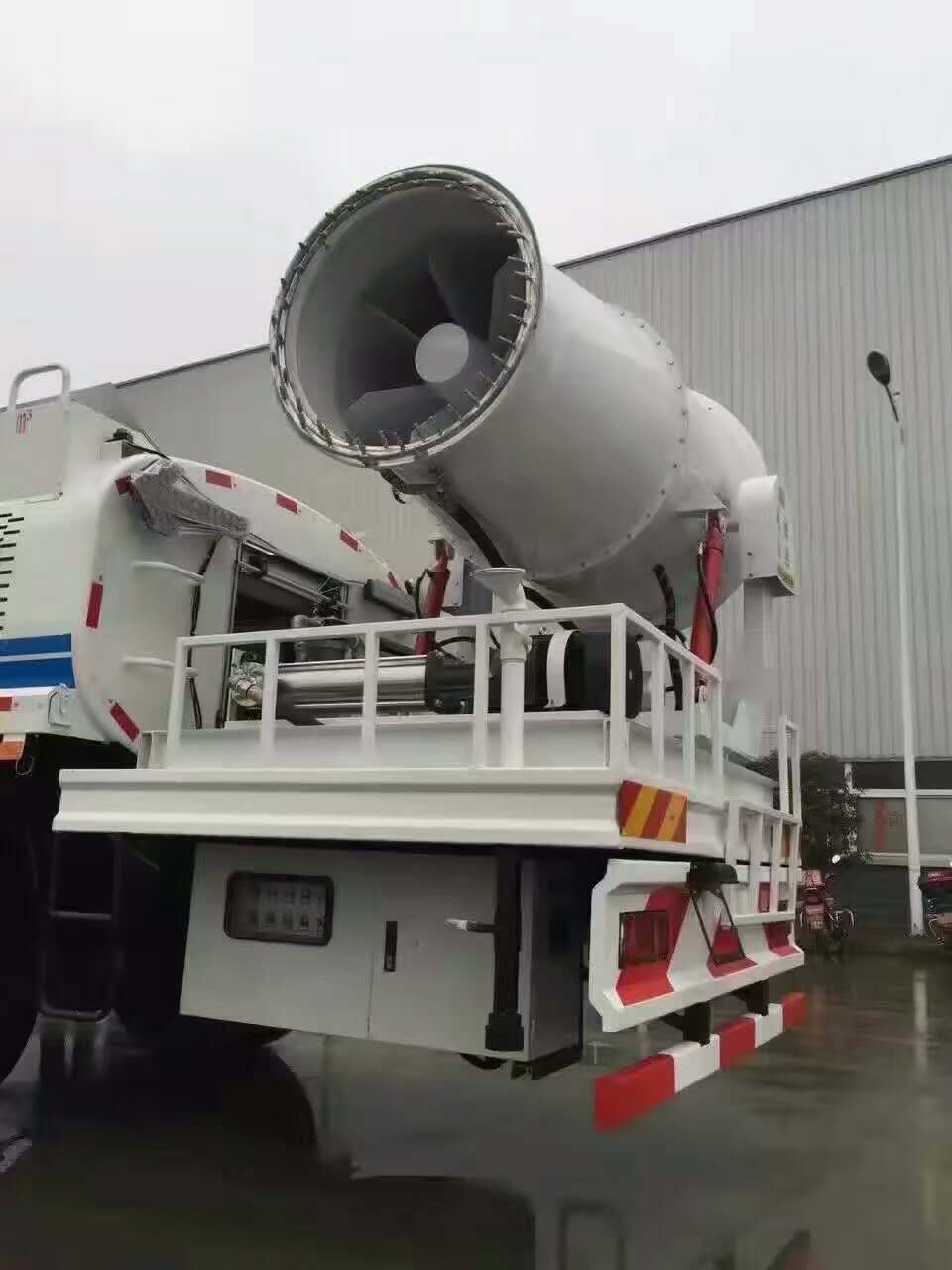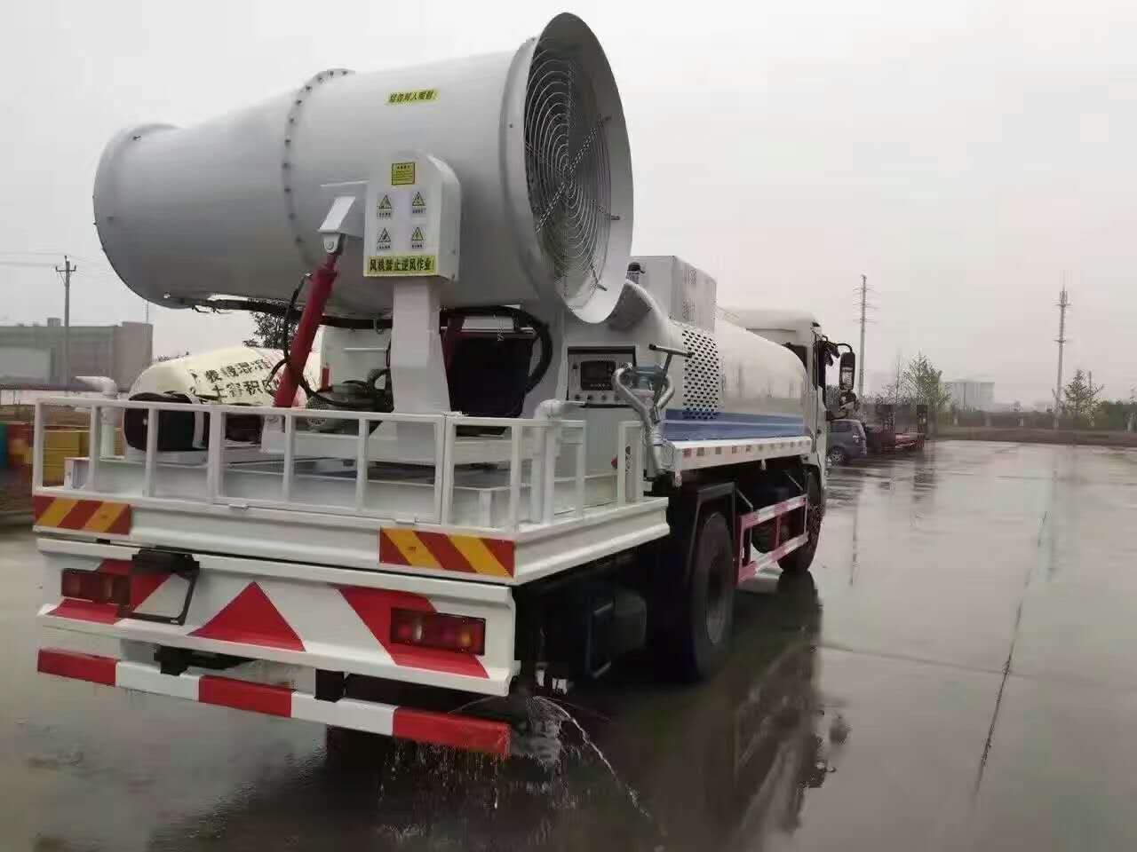 上裝采用武漢碳鋼板定制8噸水罐,配備杭州威龍灑水泵,帶前沖后灑,后置工作平臺,配備山東北華80型風機,帶柴油發電機組。最大霧化可達80米。降塵首選。