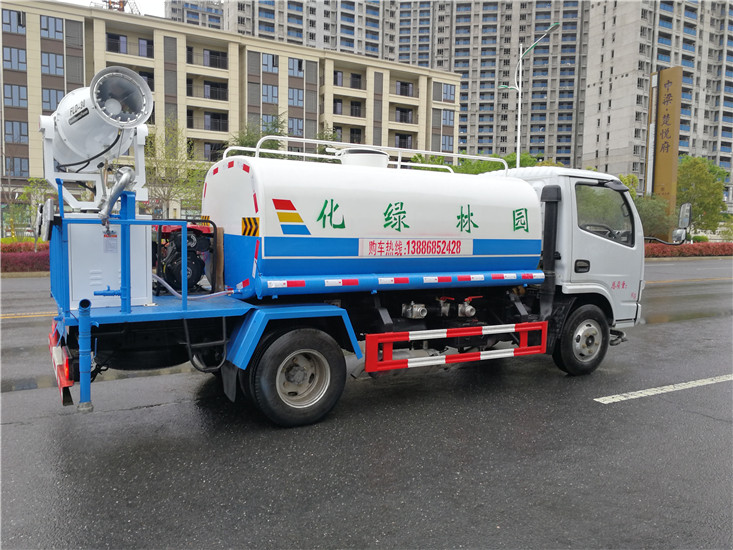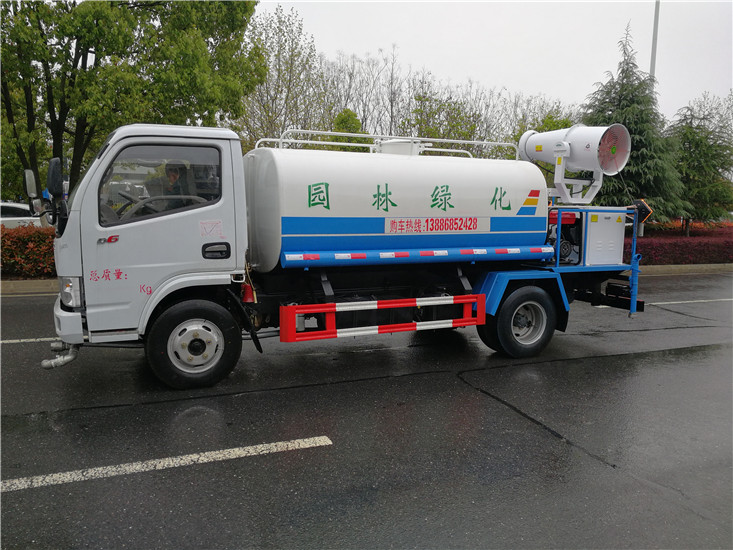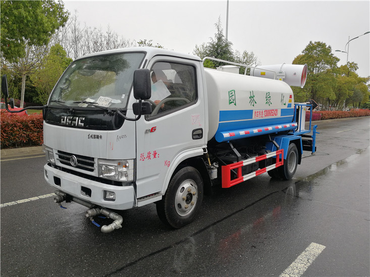 灑水車前裝有鴨形噴嘴或圓頭沖嘴,后面裝有圓柱開灑水噴嘴或蓮蓬頭噴嘴,后部有一工作平臺,裝配有水炮。帶消防接頭,帶自流閥,帶自吸功能,選配20米綠化消防卷盤。