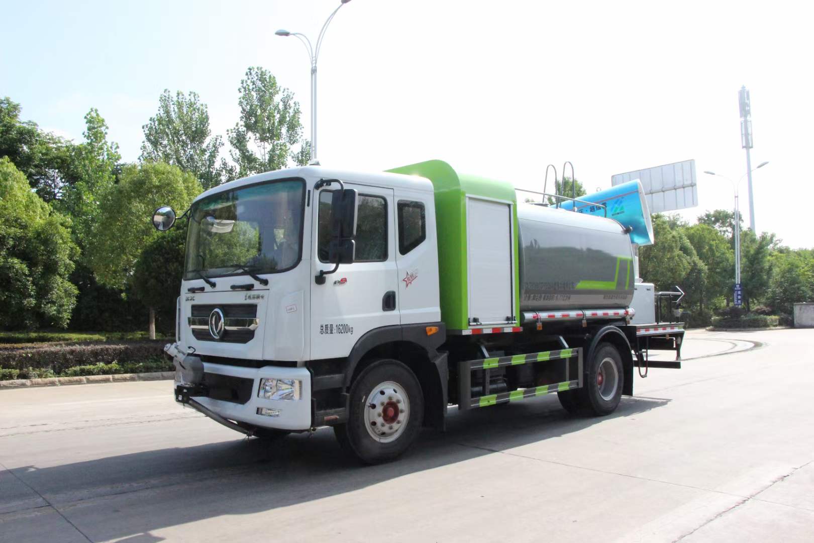 多利卡80米霧炮車_東風多利卡D9抑塵車_京牌12方抑塵車_湖北盈通專用汽車有限公司該車用途為抑塵降霾.主要裝置為罐體及噴霧裝置.罐體總容量:9.2立方米,罐體有效容積:8.77立方米,罐體外形尺寸(×長軸×短軸)(mm):2800×2450×1720.ABS系統生產廠家,型號 :焦作博瑞克控制技術有限公司,J ABS;襄陽東風隆誠機械有限責任公司,ABS/ASR-24V-4S/4M.隨底盤選裝限速裝置,限速裝置限速(km/h):89.側、后防護材料均為:Q235碳鋼,連接方式均為:螺栓連接,后部防護截面尺寸(mm):120×50,后部防護離地高度(mm):490.僅采用底盤3950mm軸距改裝.選裝燃油箱安裝位置.選裝噴霧裝置樣式,選前部電子炮樣式;選裝前部不帶電子霧炮.當前部選裝不帶電子霧炮時,車長7750mm,無前伸.當前部選裝帶電子霧炮時,車長8250mm,前伸為500mm.