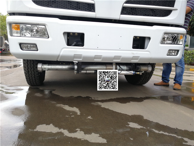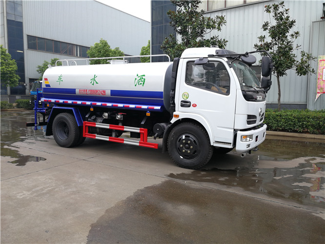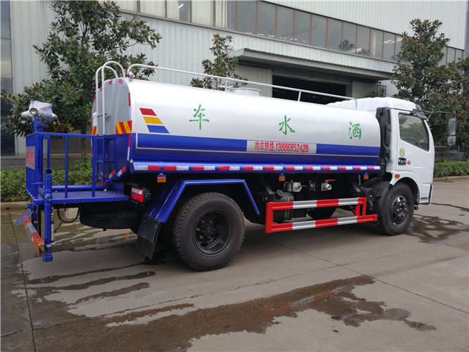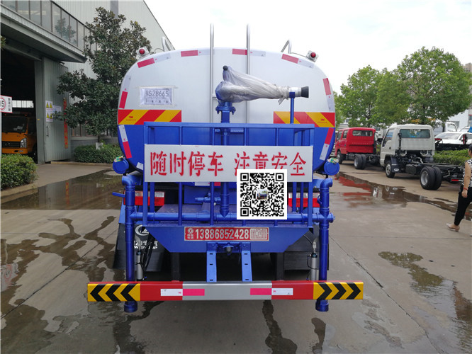 灑水車前裝有鴨形噴嘴或圓頭沖嘴,后面裝有圓柱開灑水噴嘴或蓮蓬頭噴嘴,后部有一工作平臺,裝配有水炮。帶消防接頭,帶自流閥,帶自吸功能,選配20米綠化消防卷盤。