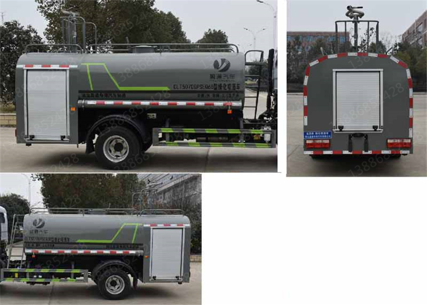 消防灑水車_遠距離消防噴水車_5方消防水罐車_消防專用水罐車_湖北盈通專用汽車有限公司該車主要用于城鄉園林綠化噴灑,噴藥;主要裝置為罐體及噴霧裝置;罐體有效容積:3.8立方米,罐體外形尺寸(×長軸×短軸)(mm):2860×1760×1100;ABS型號/廠家:ABS/ASR-12V-4S/4M/襄陽東風隆誠機械有限責任公司;側、后防護材料均為:Q235碳鋼,連接方式均為:螺栓連接,后部防護截面尺寸(mm):120×50,后部防護離地高度(mm):430.隨底盤選裝駕駛室,選裝燃油箱,電瓶,尿素罐,儲氣筒左右安裝位置.選裝噴霧裝置樣式,選裝罐體左右側及后部樣式時,后防護為專用裝置代替,離地高度為430mm。
