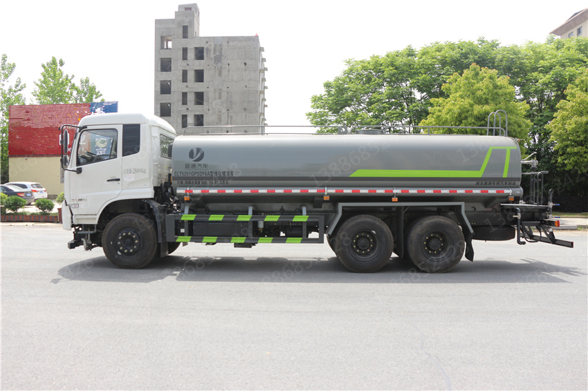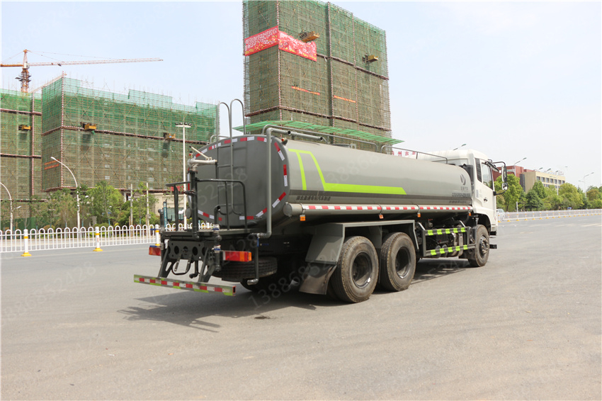 天錦22方灑水車_東風天錦22方水罐車_國六22方灑水車_天錦后雙橋灑水車,該車主要用于城鄉園林綠化噴灑,噴藥;主要裝置為罐體及噴灑裝置;隨底盤選裝駕駛室;罐體總容量:14.81立方米,罐體有效容積:14.11立方米,罐體外形尺寸(長×長軸×短軸)(mm):6800×2390×1620;側、后防護材料均為:Q235,連接方式均為:螺栓連接,后部防護截面尺寸(mm):120×50,后部防護離地高度(mm):460;ABS型號/生產廠家:3631010-C2000/東科克諾爾商用車制動系統(十堰)有限公司,J ABS/焦作博瑞克控制技術有限公司.采用底盤4350+1350(mm)軸距。選裝擋泥板樣式。選裝后部箭頭燈,選裝后部弧形噴灑裝置,選裝后部樣式,選裝水炮支架位置,選裝高位花灑管道樣式,選裝自動球閥安裝位置。
