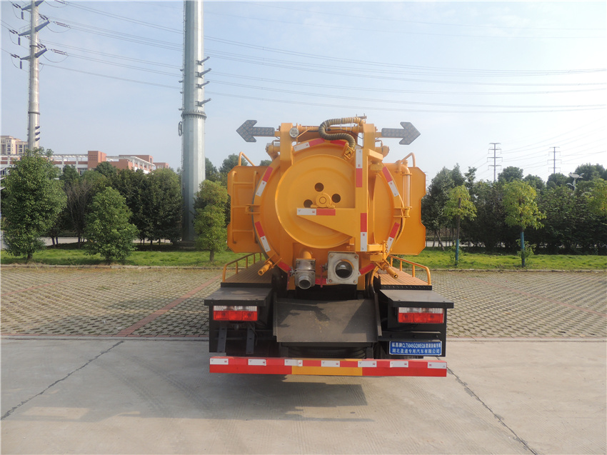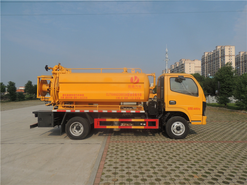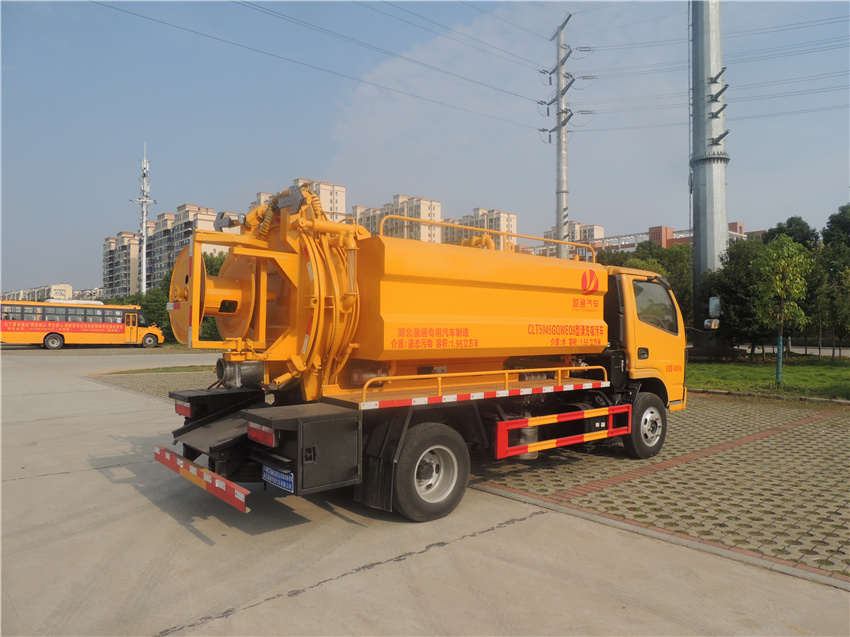 東風5方清洗吸污車,藍牌管道疏通車,抽排運污車,糞便液態吸糞車,泥漿液態轉運車,該車用于下水道排污及疏通,專用裝置:罐體及清洗吸污裝置;罐體外形尺寸(直段長×直徑)(mm):3100×1300(前部1370mm為清水罐,后部1730mm為污水罐);污水罐總容量:1.96立方米,污水罐有效容積:1.86立方米,介質:液態污物,密度800千克/立方米;清水罐總容量:1.56立方米,清水罐有效容積:1.49立方米,介質:,密度1000千克/立方米,清水罐和污水罐為獨立罐體,清洗功能時用清水罐,吸污功能時用污水罐,污水罐和清水罐不可同時滿載;ABS型號/廠家:ABS/ASR-12V-4S/4M/襄陽東風隆誠機械有限責任公司;卸料方式為舉升后卸式;側、后防護材料均為:Q235碳鋼,連接方式均為:螺栓連接,后部防護截面尺寸(mm):120×50,后部防護離地高度(mm):370.隨底盤選裝駕駛室,選裝底盤附件安裝位置.選裝燃油箱,電瓶,尿素罐,儲氣筒左右安裝位置