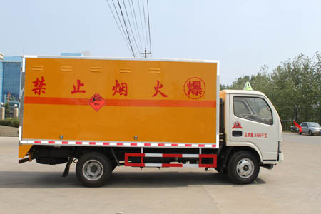 選裝新造型的前面罩。選裝不開門廂體。廂體頂部封閉,不可開啟:側/后防護裝置材料材質為Q235A碳鋼,側防護與副梁,后防護裝置與車架均采用焊接連接,后防護斷面尺寸(寬贅?50?20(mm),離地高度為450mm.運輸品名:炸藥,雷管,煙花爆竹等,類項號:1.1B,1.1D,1.1G,1.2G,1.3G,1.4G 等;安裝帶衛星定位功能的行駛記錄儀;配裝限速裝置,最高時速80km/h。僅采用有前盤制動器和安裝ABS的底盤。僅采用子午線輪胎。ABS系統型號及生產廠:36BG13-30010/東風電子科技股份有限公司汽車制動系統公司。僅采用排氣管前置的底盤。僅采用4B28ATCI,CY4102-CE4D,D28D11-4DA,SD4M824U,YC4FA115-40,YN38CRD2,ZD30D13-4N發動機,對應油耗值分別為13.28,12.93,12.88,13.11,12.89,12.96,12.82。